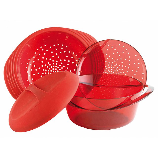 - Bộ nồi hấp Mastrad 2-trong-1 bao gồm: một rổ nhựa trong, một nồi silicone dẻo, một ngăn hấp bằng nhựa trong và một nắp nồi silicone