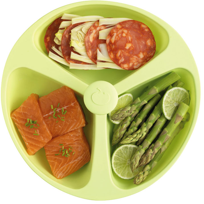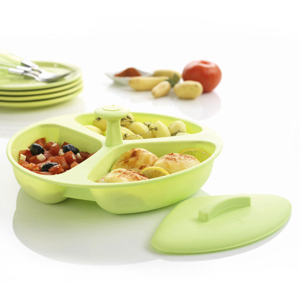 - Nồi silicone hình tròn với 3 ngăn tách biệt, dùng để chuẩn bị khẩu phần cho từ 2 – 4 người ăn