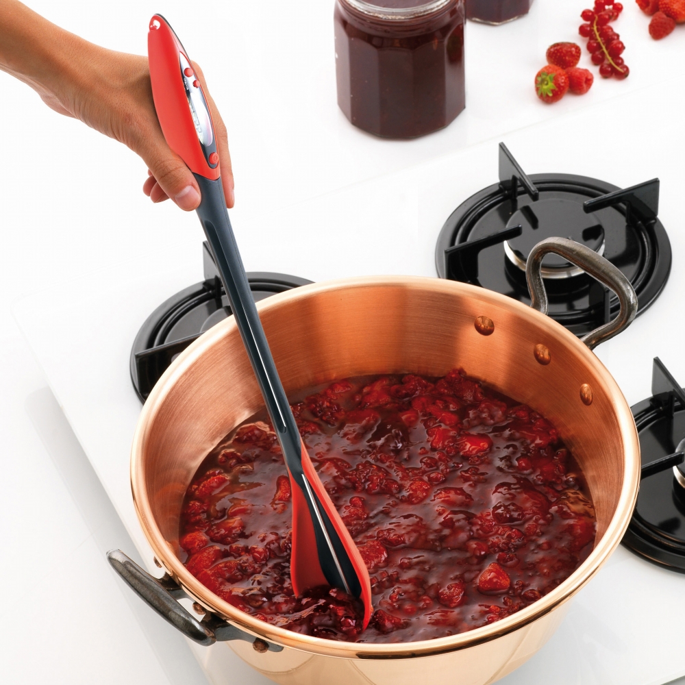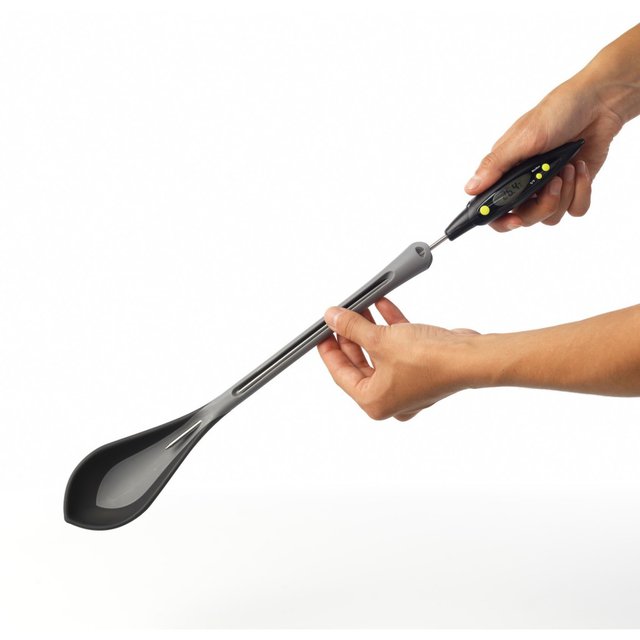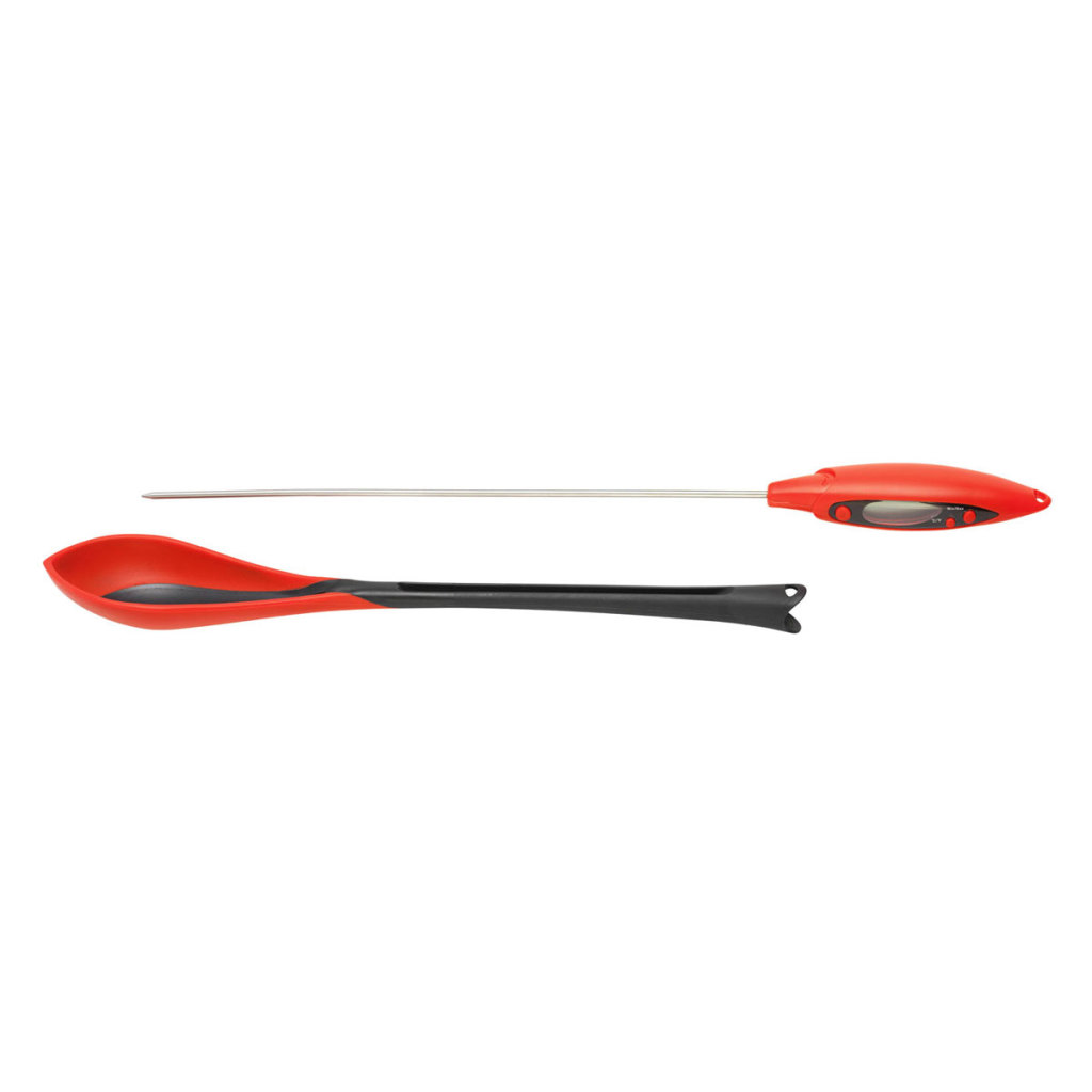 Thìa nhiệt kế 2 trong 1 của Mastrad giúp bạn đo nhiệt độ của món súp, hầm. Sản phẩm có thể được tách rời thành thìa nấu ăn silicone và nhiệt kế xiên que.